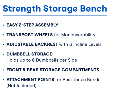 Echelon Strength Storage Bench fits and organizes most standard dumbbells, kettlebells, and includes attachment points for 2x resistance bands (not included). Keep your space clutter-free and your workouts seamless with the front and rear storage compartments.